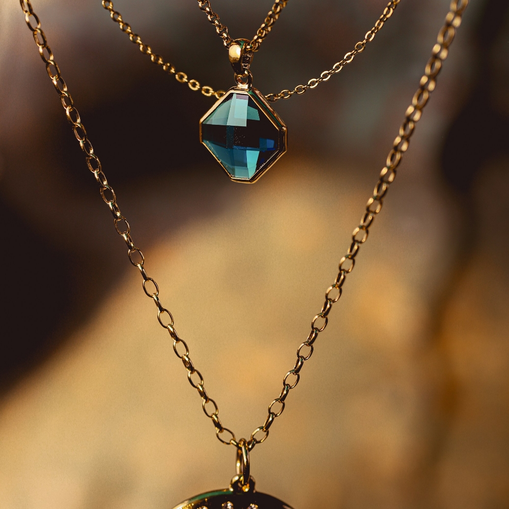 以經典的祖母綠切工(Emerald Cut)為靈感,深邃的藍綠色寶石在光線下折射出如湖水般粼粼的層次感。搭配精緻的金色包邊設計,復古中不失摩登氣息。這不只是一件飾品,更是頸間的一抹深邃詩意,無論是正式晚宴或日常簡約穿搭,都能瞬間提升氣場。